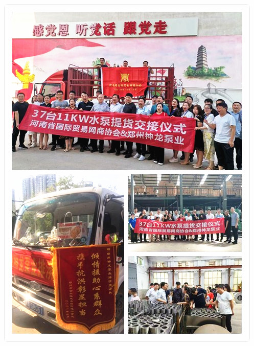 河南國(guó)際貿(mào)易網(wǎng)商協(xié)會(huì)、神龍泵業(yè)水泵提貨交接,未來(lái)路街道贈(zèng)神龍排澇突擊隊(duì)錦旗