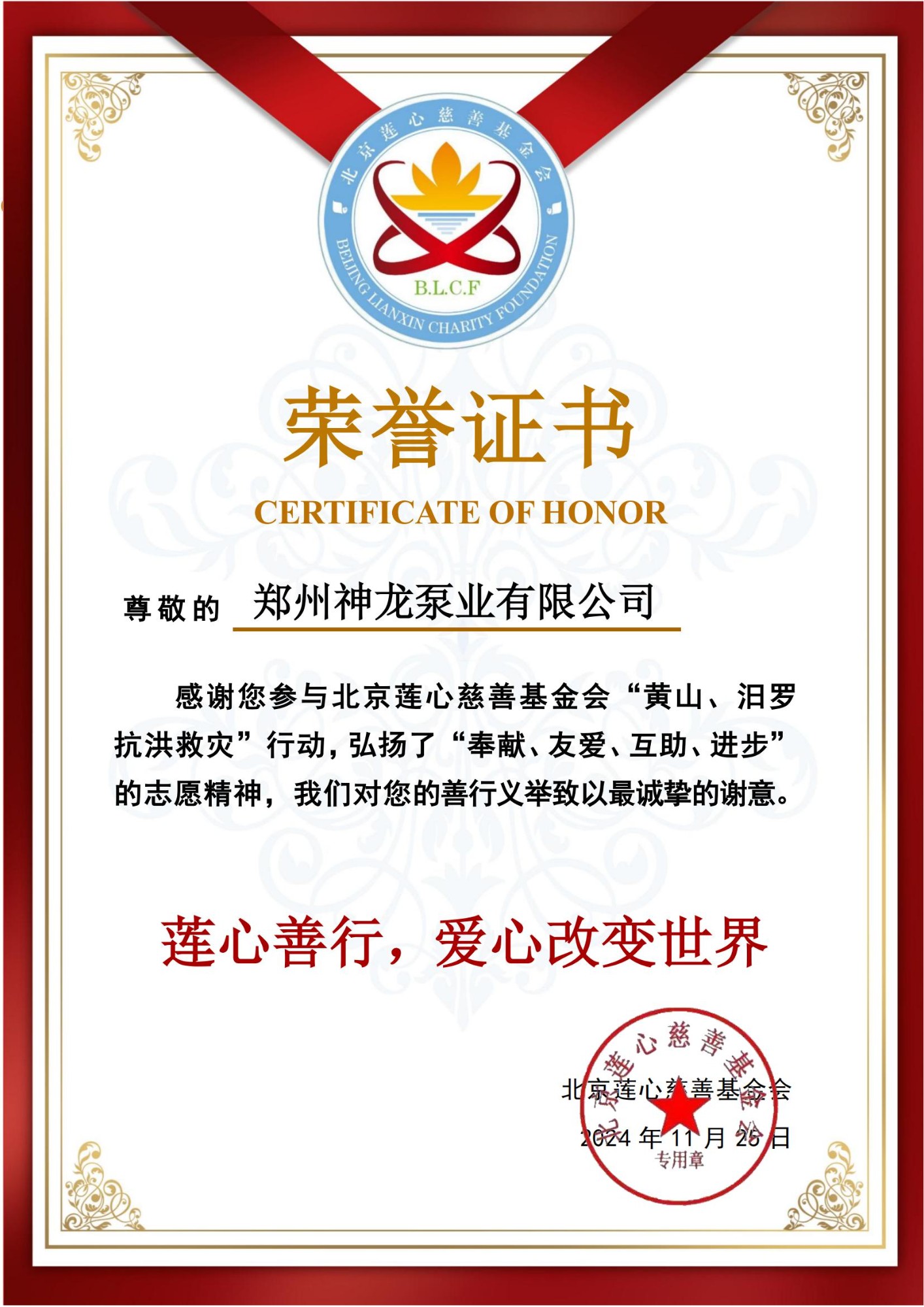 北京蓮心慈善基金會(huì)感謝鄭州市神龍泵業(yè)有限公司參與“黃山、汨羅抗洪救災(zāi)”行動(dòng)